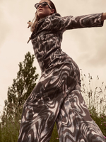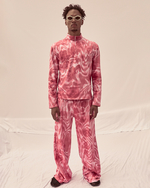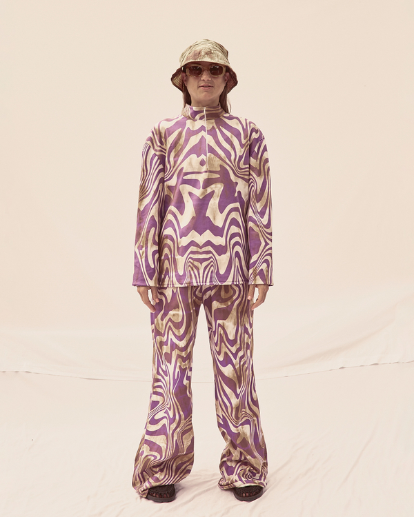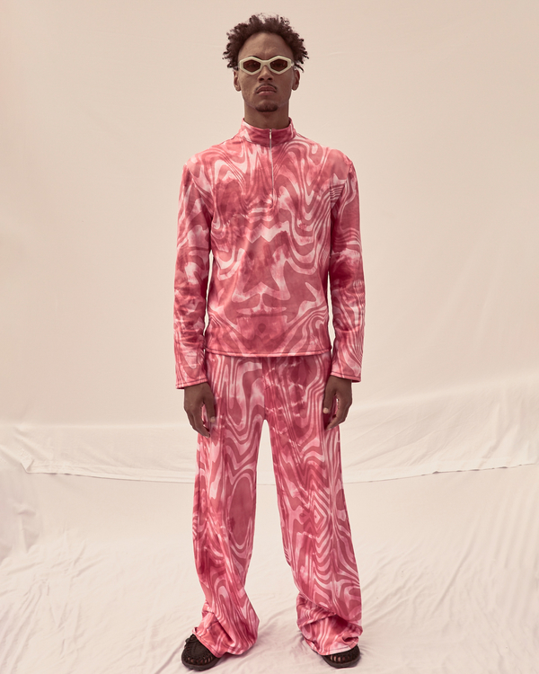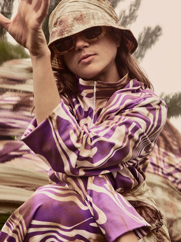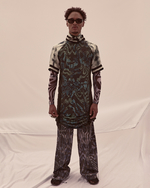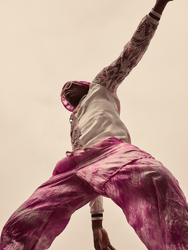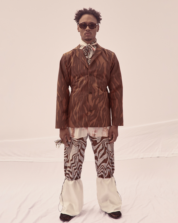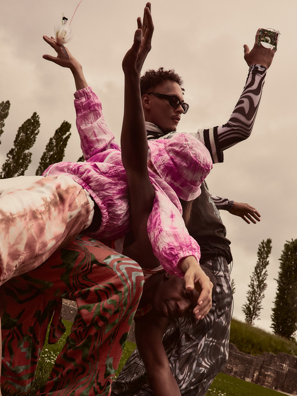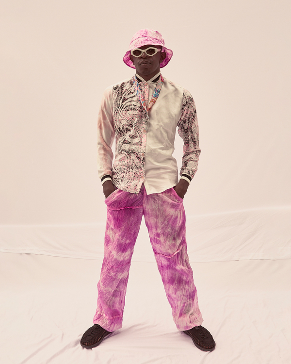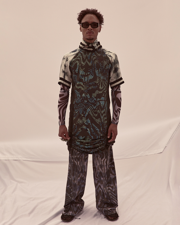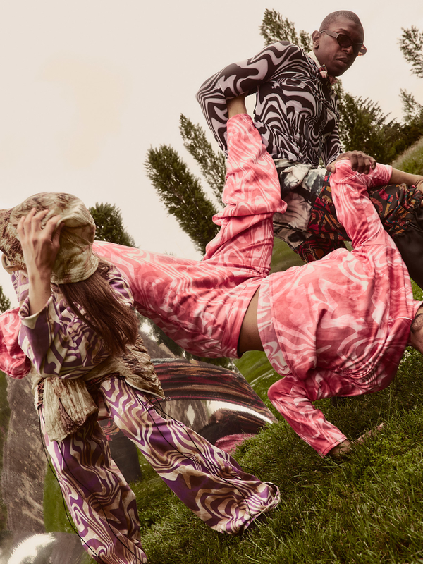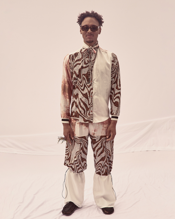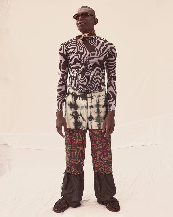 Rafael Kouto explores the revival of the rave with his new upcycled collection, merging African and Western influences with a psychedelic twist. The Swiss upcycling couture brand releases a limited edition collection titled A post summer solitary reverie of a rave in collaboration with The Zurich Silk Association. This collection doubles as a cultural project, aiming to preserve the authentic savoir faire of the Swiss fashion and textile industry by situating it in an international and contemporary context. The garments of this capsule collection are crafted using upcycled silk from the textile archive of the Zurich Silk Association (Zürcherische Seidenindustrie Gesellschaft), an association of active and former companies in the Zurich silk industry and one of the oldest business associations in Switzerland. Rafael Kouto selected fabrics from the 2011 exhibition Soie Pirate, Textil Archiv Abraham, which captured the traditions of Switzerland’s haute couture silk trade. Abraham Ltd was central to this trade, collaborating with Parisian couturiers for the creations of iconic fashion houses. In a 1966 Women’s Wear Daily interview, Ludwig Abraham, founder of L. Abraham & Co. Seiden AG, states, “The truth of the classic beauties should not be lost in six months.” This has become the guiding thread of Rafael Kouto’s collection: reworking vintage textiles by reimagining their beauty and extending their life cycle.
