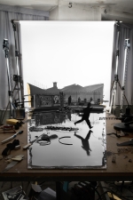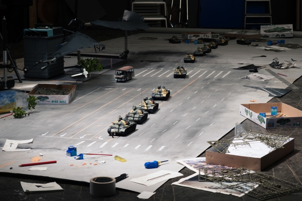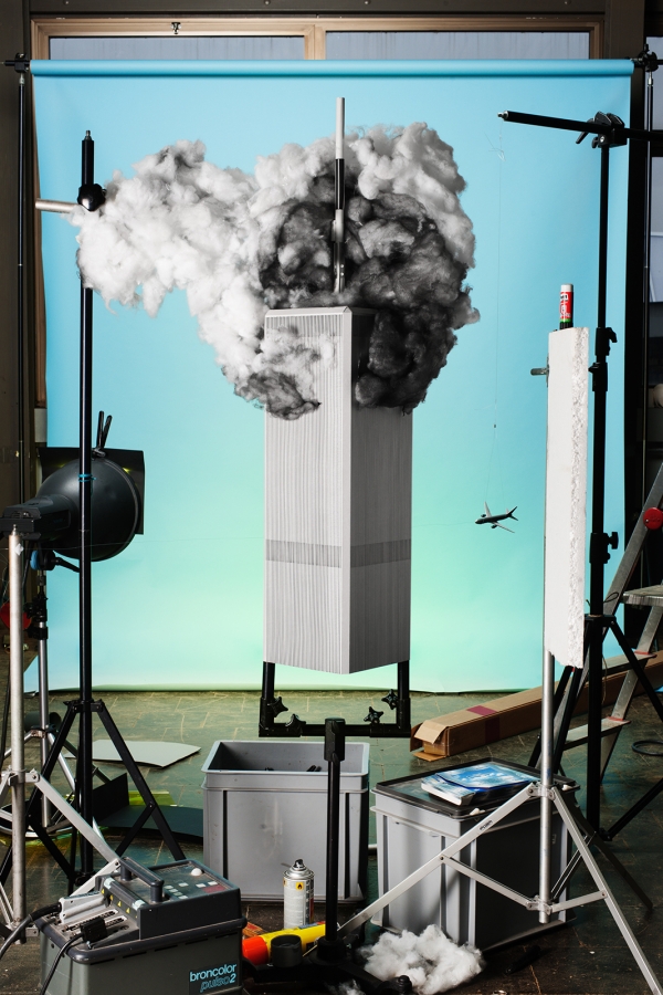 In the Icons series, the two photographers recreate icons of photographic history as three-dimensional dioramas in the studio. The models are then photographed. This creates images that seem to resemble the originals down to the last detail. However, the seamless illusion is immediately undermined by bringing the studio setting and the traces of the work process into the picture. Scenes that have become deeply inscribed in our collective memory—the burning Twin Towers, Robert Capa’s falling militiaman in the Spanish Civil War or Stuart Franklin’s photograph of the “Tank Man” on Tiananmen Square—rise up between tripods, soft boxes, Stanley knives and the remains of model kits.