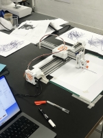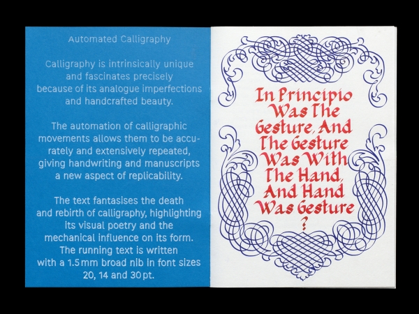 The era of manuscripts is long gone. Today’s norm revolves almost exclusively around printed matter, making the manual reproduction of texts absurd and obsolete. A certain poetry and beauty emanate from the imperfections, however, time and gestures intrinsic to calligraphy seem to lend a rare and precious character to manuscripts as a calligraphic work is unique and cannot be replicated identically. The concept of automated calligraphy is crystallised halfway between ancestral practices and contemporary technologies, replacing hand gestures with mechanical movements. The CNC machine (or Pen Plotter) can imitate these gestures with precision, as well as executing more complex movements that are impossible to achieve manually. The automation of calligraphy is an attempt to give handwritten texts new aspects of reproducibility, precision and efficiency, while trying to preserve the aura of calligraphy, with its distinct movements, tools and aesthetic.