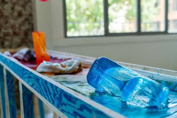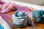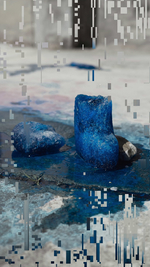 The video installation Don’t Steal our Sunlight deconstructs and reconstructs the creative process, showing the possibility of creating a new narrative by emphasising the consequences of climate change. • The melting of glaciers and desertification are performed through two different traditional textile production techniques for the creation of unique upcycled garments. The body of the performer becomes both medium and tool: on one screen, the ice sculptures containing textile dye melt directly on the body and the garments, made of discarded and screen-printed jersey. On the other screen, the painting is done by airbrush with natural powder pigments on leather scraps assembled with a special crochet technique. • The two videos were filmed in a disused cement factory in Ticino, a symbol of the exploitation of the Earth’s resources and human intervention in the cycles of nature. • The special effects in the video are data taken from the Intergovernmental Panel on Climate Change, translated into disruptive visual elements addressing the trends of expansion of deserts and the shrinking of polar caps from now until 2050.