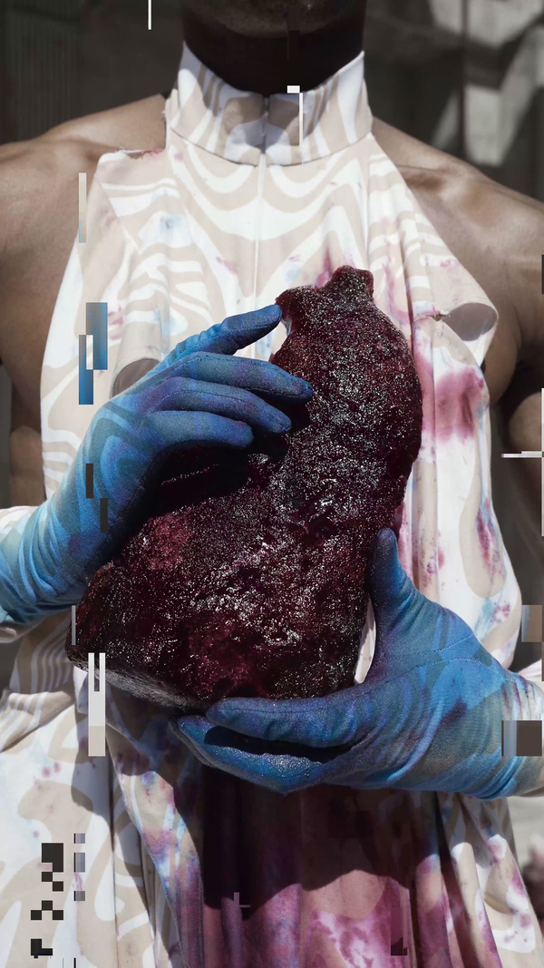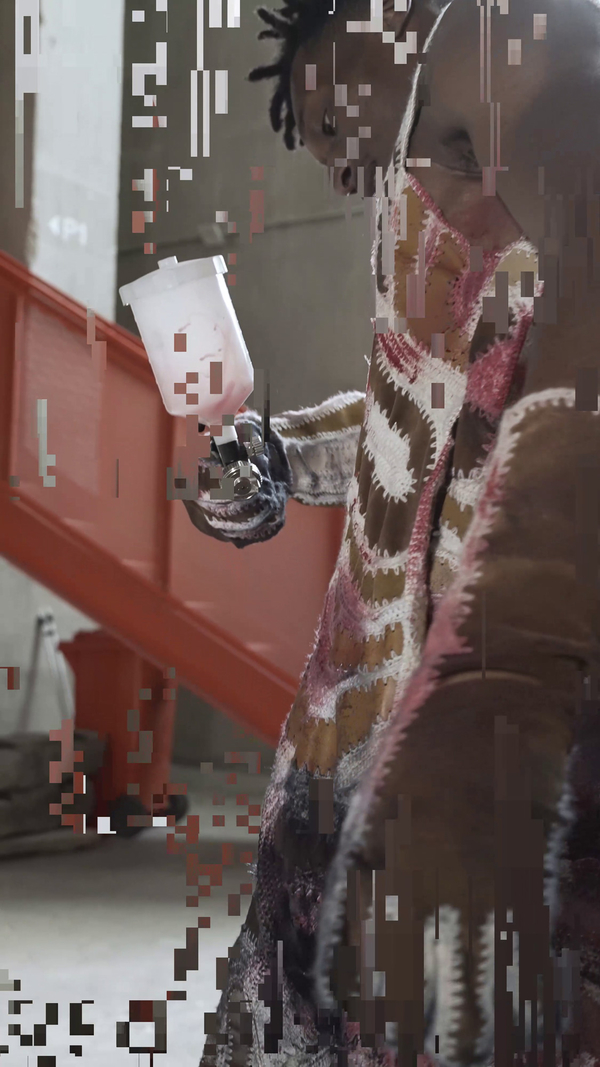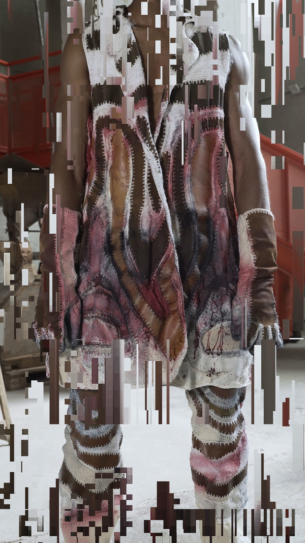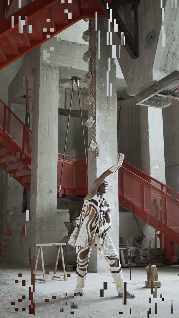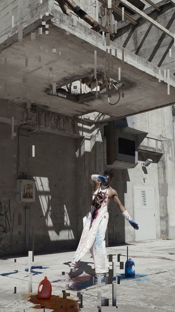 In collaboration with the Istituto Svizzero di Roma during the residency Milano Calling 2021/2022; Concept and creative direction: Rafael Edem Kouto; Digital art direction: Emidio Battipaglia; Data art: Federico Peliti; Camera and colouring: Francesco Caruso; Sound: EMÆNUEL; Performer: Jonathan Muadianvita; Choreographer: Karin Rose, Accademia Teatro Dimitri; Production: Matilde E. Tettamanti, META – Production; location: Torre dei Forni, Parco delle Gole della Breggia, Morbio Inferiore; Production items in collaboration with:; Crochet: Griscenda Niggli & Rita Bontempi; Print: TDS, Textildruckerei Arbon; Pattern: Joshua Althaus; Sewing: Alice Materni; Leather accessories: Nicola Sartorio
