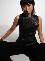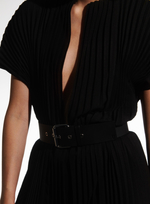 Dress fabric, hand-pleated; Skirt, leather, hand-pleated; Neckholder top, leather and fabric, hand-pleated; Wrap top, leather; Trousers, fabric, hand-pleated; Bag, leather, hand-pleated; (Additional accessories from our Core collection)