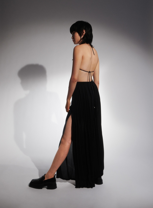 Yvonne Reichmuth’s long-standing interest and passion for leather led her to found the eponymous brand YVY, which celebrates the art of leathercraft and explores new techniques while staying true to its minimalist aesthetic. In 2022, following a journey of curiosity, a collaboration commenced with craftswoman Eva Ott to create a capsule collection that combines hand pleating with leatherwork. The resulting collection, A Timeless Craft, A Labour of Love showcases the beauty of combining traditional craft with today’s zeitgeist. Each piece is crafted by hand, creating an architectural aesthetic that embraces the wearer’s curves. The sensual interplay of the soft, flowing fabric and the structured geometry of the leather pieces creates a unique and empowering feeling, further enhancing the transformative nature of YVY’s work. • The carefully curated collection consists of modular clothing and accessories that offer versatility in styling, each a labour of love that celebrates timeless craftsmanship.