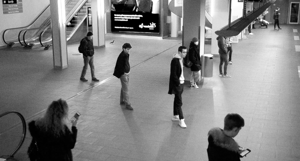 3 double-sided F4 panels (normally used for public advertising) from SGA APG; installed on the floor in the middle of the space (not on the walls) = 6 posters; 1–3 iPads or small screens showing videos.