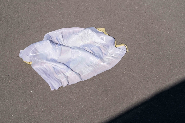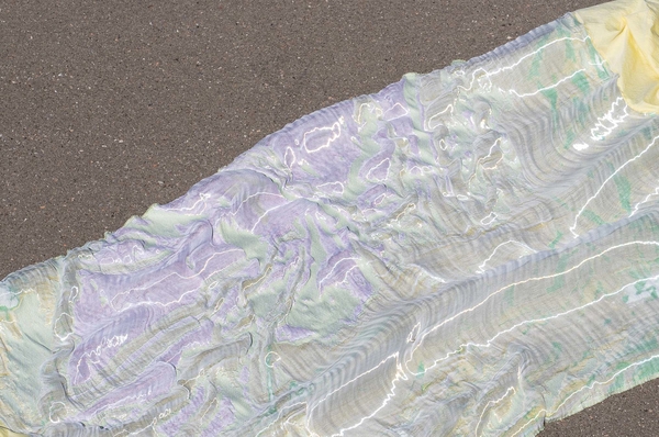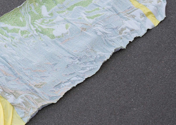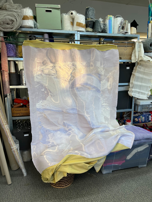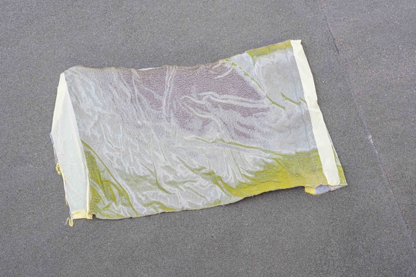 The series of soft sculptures and objects made on industrial jacquard weaving looms in Appenzell questions the textile status quo. How to embody soft space? How to act textile? • The act of displaying highlights something, gives it importance. We then maybe focus, get closer, touch. K.L.H. Wells, meanwhile, describes the textile ambivalence thus: “To display a textile generally makes it functional, but a textile on display also commonly conceals something behind or beneath it.” 1 • Half of the process displayed took place digitally. Through active gestures 2 of unfolding, shaping and inhabiting one can create visibility, but at the same time communicate 3 and create new (textile) connections in both worlds, virtual and real.