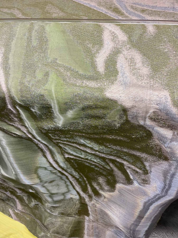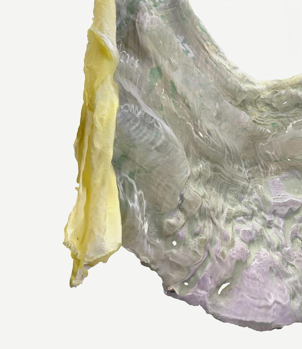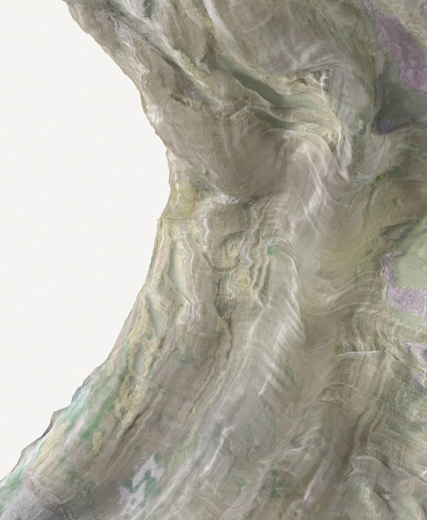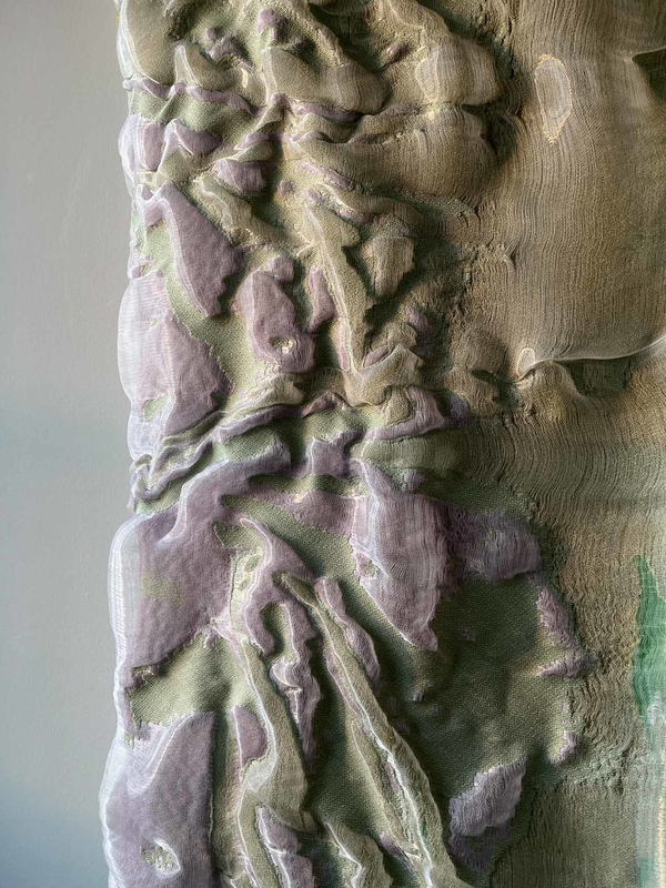 Zurich (studio), Appenzell (weaving mill). Within my work, I move between theoretical and practical research. Project in which, on the technical side, I pushed the boundaries of the loom with Monosuisse Monofil yarn and its properties. This yarn is very stiff and “fights” against the usual shrinking percentage of woven fibres. I used this potential to build up three-dimensional textiles by combining it with super-high shrinking yarn. Using a hollow weft and a fine warp at the same time additionally creates three-dimensional, light-reactive surfaces that behave like bodies but look like screens.