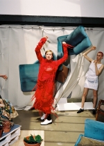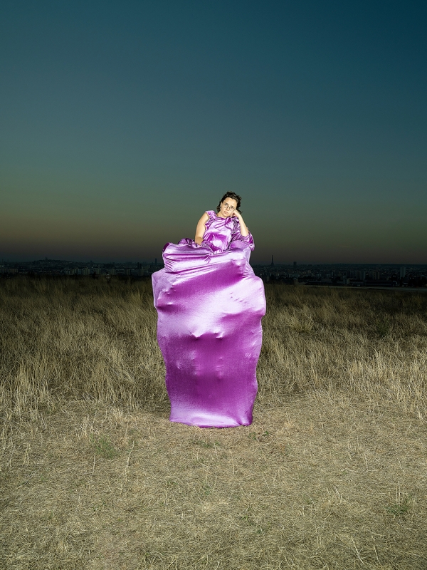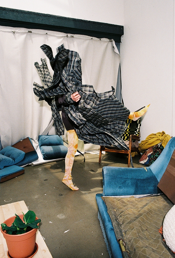 Borrowing from wardrobe codes and everyday aesthetics, Josiane experiments with clothing as if she knew nothing of its function or even the right way to put it on. She tests its resistance by pulling on it, cuts it to play with its structure, has it worn by a plant or a piece of furniture to see how it takes shape, tries to wear it in different ways to create tension.