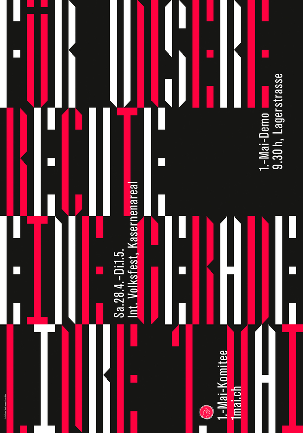 Since 2008, the graphic design studio Studio Nüssli+Nuessli has designed the iconic May Day poster for the 1.-Mai-Komitee Zürich. The committee, composed of over 50 political groups, has organised Zurich’s annual Labour Day demonstration and celebration since 1980.