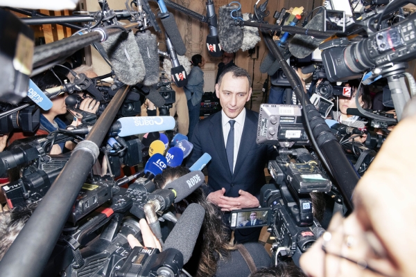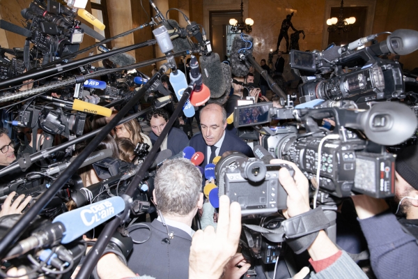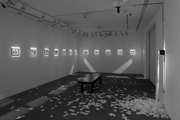 The work, which incorporated reconstructed images and a printing device, examines the relationship between contemporary news and certain players of the French media-political theatre. The installation presents 20 images, resulting from digital assemblages made from photographs taken at the National Assembly and Palais de Justice in Paris. Facing these images is a device that prints live headlines from various conventional news sources broadcast on the social media platform BlueSky.