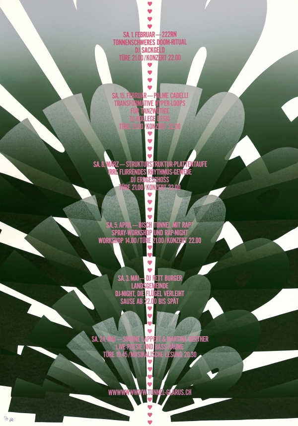 The Tunnel poster series is a biannual poster edition for a local cultural venue in Glarus. The name Tunnel comes from the fact that the entrance to the club is on the side of an underpass with a round arch. All posters have been printed manually on letterpress printing presses that are around 60 years old. A physical printing form has to be produced for each poster, size and colour pass. Due to this slow and meticulous process, materials and resources have to be used mindfully—this also helps to keep the project within budget. For this reason, the labour-intensive hand-cut linoleum shapes for each poster have been used for both the small and large versions of the posters. This technical restriction in production is also one of the main visual restrictions in design—and a great challenge to keep each one of these large and small posters visually compelling.