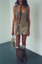 • LOOK 1: Merino Knitted Dress, Merino Knitted Top, Nez Noir & Embroidered Leather Handbag, Alpaca Crochet Socks, Alpaca Crochet Necklace • LOOK 2: Merino Knitted Long Sleeve, Mixed-Wool Knitted Panties, Upcycled Leather Mini-Bag, Upcycled Leather Shoes • LOOK 3: Flax Knitted Top, Flax Crochet Bra, Alpaca Knitted Mini Skirt, Mixed-Wool Alpaca Necklace, Upcycled & Embroidered Leather Mini-Bag, Flax Knitted Mini Bag, Leather & Wool Embroidered Boots• LOOK 4: Merino Knitted Long Sleeve, Mixed-Wool Knitted Panties, Upcycled & Embroidered Leather Mini-Bag • LOOK 5: Mixed-Wool Knitted Dress, Alpaca Crochet Panties • LOOK 6: Alpaca Knitted Top, Mixed-Wool Knitted Shorts, Upcycled & Embroidered Leather Bag, Blanc des Alpes Crochet Socks • LOOK 7: Upcycled Leather & Knitted Handbag, Merino Knitted Long Skirt• LOOK 8: Nez Noir Knitted Jumper, Upcycled & Embroidered Leather & Nez Noir Bag, Merino Knitted Mini Skirt, Upcycled & Embroidered Leather Belt Bag, Blanc des Alpes Crochet Necklace, Merino Knitted Foulard, Brun du Jura Crochet Socks • LOOK 9: Mixed-Wool Knitted Top, Brun du Jura Knitted Bodysuit, Alpaca Crochet Shoes, Upcycled & Embroidered Leather Mini-Bag • LOOK 10: Flax Transparent Knitted Dress, Mixed-Wool Knitted Top, Mixed-Wool Knitted Panties
